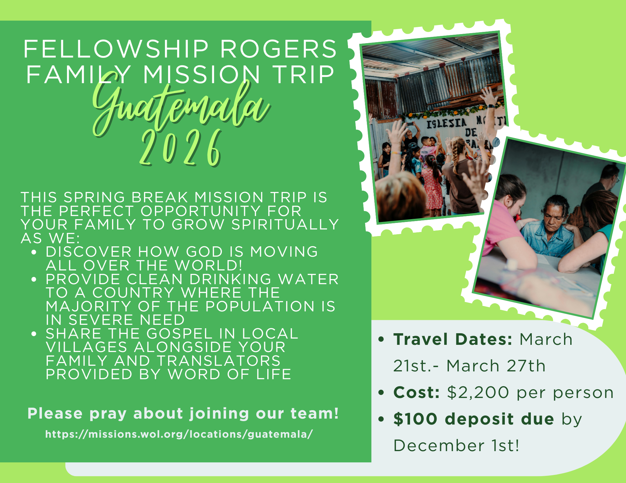 Our team is traveling to Southeast Asia to partner with long-term global workers from Fellowship Fayetteville. We’ll be serving on a local college campus—building relationships, having gospel conversations, and investing in students’ lives. In addition to our campus ministry, we’ll spend time in the mountains supporting projects that provide clean, accessible water for rural communities. This trip is an opportunity to come alongside ongoing ministry, meet practical needs, and experience the beauty of another culture while sharing the light of Christ.